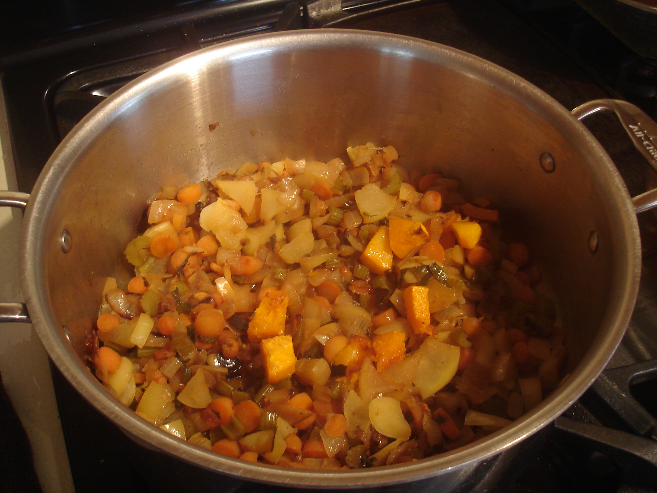Ingredients 2 Medium Butternut Squash (peeled, cored and cubed; approximately 7 cups) 4 T Olive Oil 1 1/2 c Onion (chopped) 1 1/2 c Carrot (peeled and chopped) 1 1/2 c Celery (chopped, including leaves) 2 1/2 Medium Apples (cored and chopped) 1/2 c Apple Juice 8 c Broth (Vegetable broth to make it vegan) Salt & Pepper to taste Pine nuts (optional)