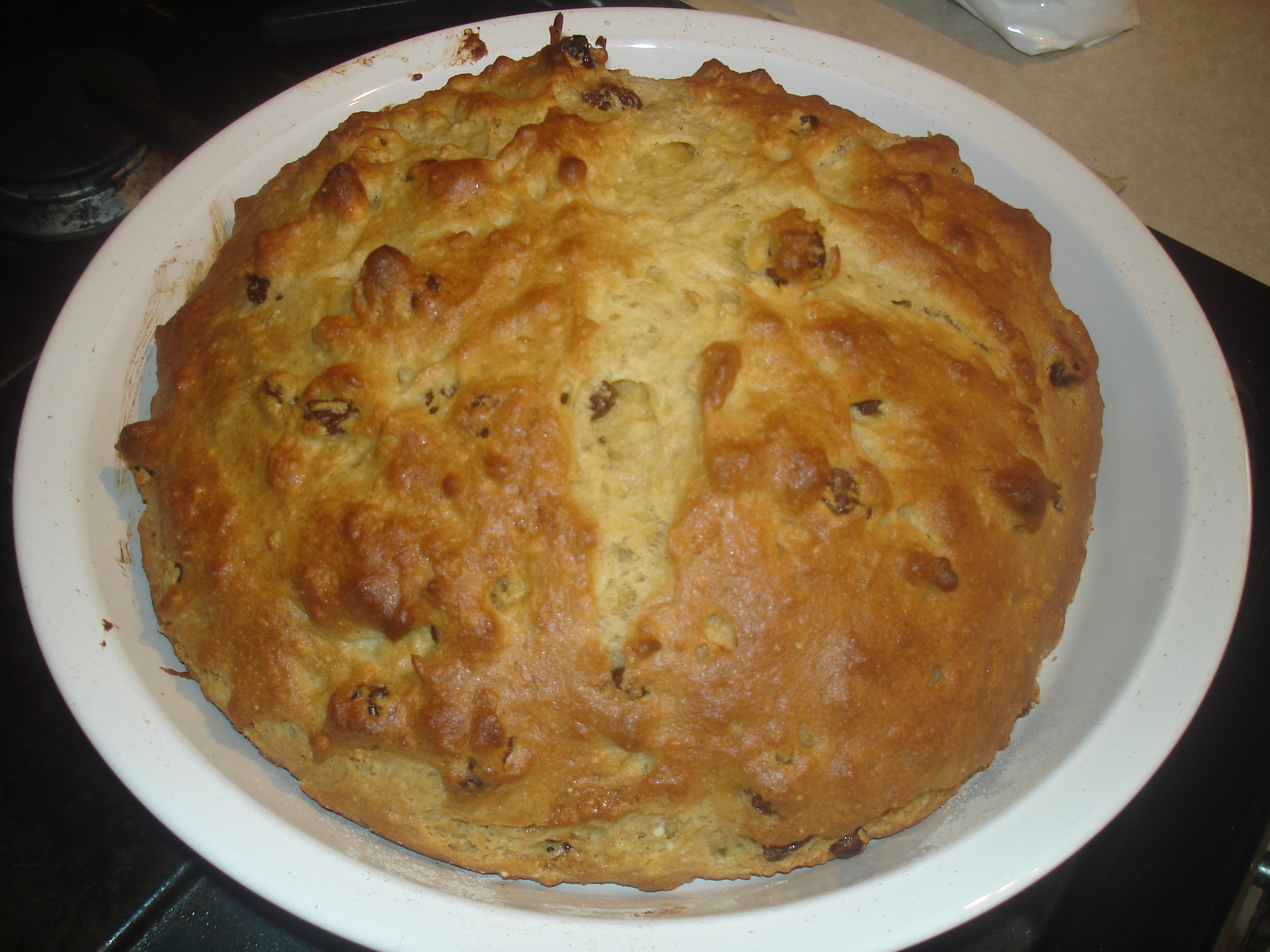 Preheat oven to 375. Grease cake pan. Combine flours and other dry ingredients together in a large mixing bowl. Add raisins in with dry ingredients and stir to coat with flour. Combine the wet ingredients together in a separate bowl. Slowly pour the wet into the dry ingredients, gently mixing as you go. The dough will be sticky and moist. Scrape out the dough and place it into the center of the greased cake pan. Use oiled hands to mound the dough into a rustic round loaf. Slice a small criss-cross into the center of the dough. Place the pan into the center of a preheated oven. Bake for about 30 to 33 minutes, until the loaf is golden and firm. Insert a wooden toothpick into the center to test for doneness.Recipe based on “The Spotted Dog” at Gluten Free Goddess.