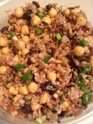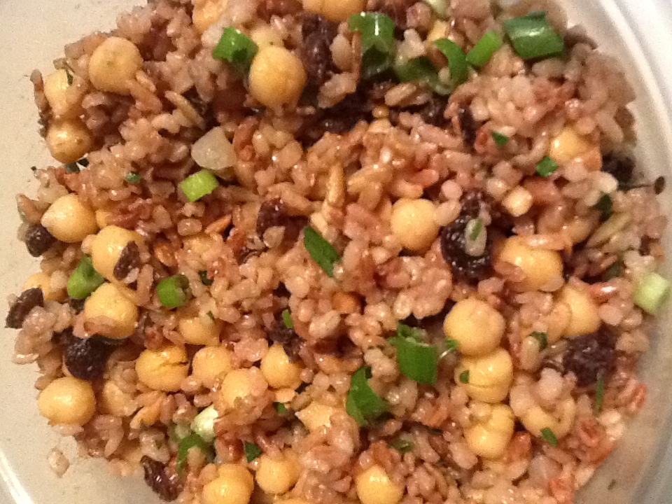 - Bring broth to a boil. Add rice, cover and simmer for approximately 45 minutes or until liquid is absorbed. Remove from heat, and let stand, covered, 5 minutes. Spoon rice into a medium bowl. Add chickpeas, raisins, and green onions.